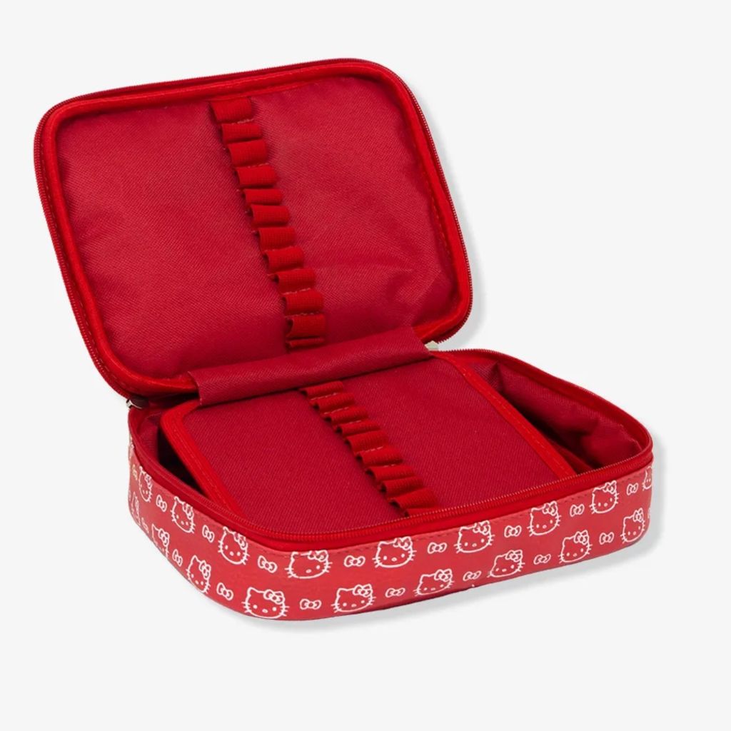 Este Estojo Box 100 Pens Hello Kitty Zona Criativa é o acessório perfeito para fãs da personagem que buscam organização e funcionalidade. Com um design encantador nas cores branco e vermelho, este estojo oficial da Zona Criativa é fabricado em tecido sintético e nylon, garantindo durabilidade e resistência para o dia a dia escolar ou de trabalho. Ele conta com duas partes internas equipadas com elásticos, ideais para fixar até 23 canetas ou lápis, além de um espaçoso compartimento principal que acomoda todos os seus materiais escolares e de escritório, como tesouras, borrachas e marcadores. É a solução ideal para manter tudo em ordem e com um toque de diversão.