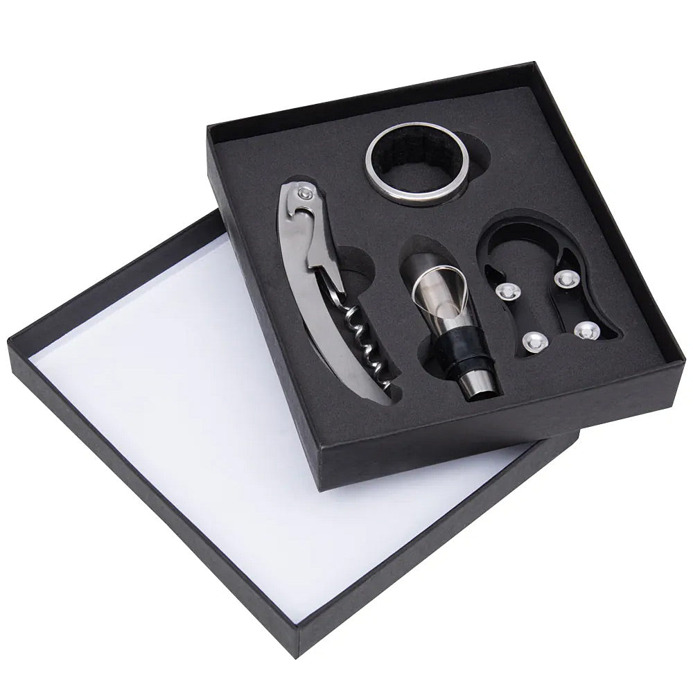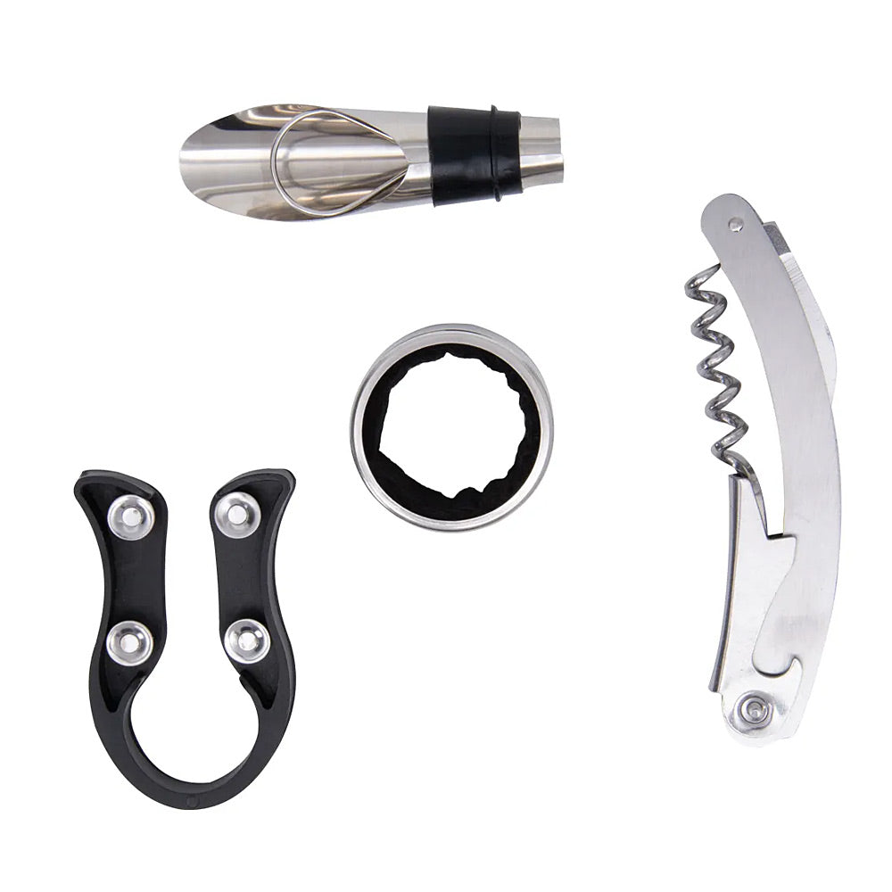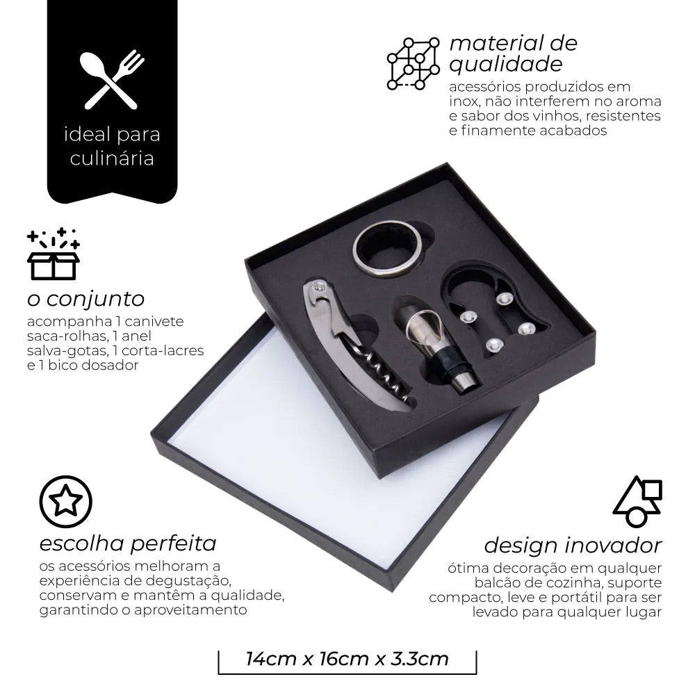 Itens inclusos: Anel salva gotas, canivete saca rolhas, cortador de lacre e bico dosador.