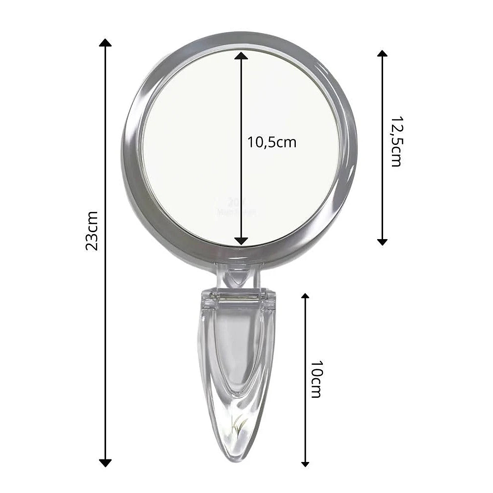 Este espelho possui duas faces e um suporte para seu conforto. Um dos lados possui reflexo convencional e o outro lado apresenta um aumento de 20X.