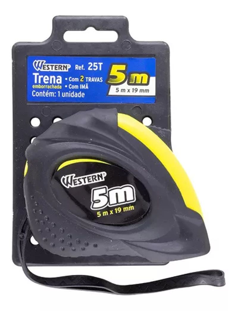 Obtenha medições precisas e confiáveis com a Trena Emborrachada 5 Metros Western A Trena Emborrachada 5 Metros com 2 Travas da marca Western é a ferramenta ideal para profissionais que necessitam de precisão em suas medições. Com sua fita de aço temperado de 5 metros e 19mm de largura, é resistente e durável para uso contínuo. As duas travas proporcionam segurança ao estender e recolher a fita, garantindo medições precisas a cada uso. Fita emborrachada para maior aderência e conforto durante o manuseio. Dupla trava para fixação segura da fita durante as medições. Base magnética para apoio em superfícies metálicas, facilitando o trabalho em diversas situações. Material de alta qualidade, garantindo durabilidade e resistência. Realize medições de forma precisa e eficiente em diferentes ambientes. Ideal para uso em construções, marcenarias, projetos de arquitetura, entre outros. Compacta e fácil de transportar, sendo um item indispensável no dia a dia de trabalho. Antes de cada medição, certifique-se de que a fita esteja estendida e devidamente travada. Utilize a base magnética em superfícies metálicas para garantir maior estabilidade durante a medição. Após o uso, limpe a fita e armazene em local seco e seguro para prolongar sua vida útil. Marca: Western Modelo: Trena Emborrachada 5 Metros com 2 Travas Comprimento da Fita: 5 metros Largura da Fita: 19mm Material: Aço temperado e borracha Garantia: 3 mesesTrena Emborrachada 5 Metros com 2 Travas - Western